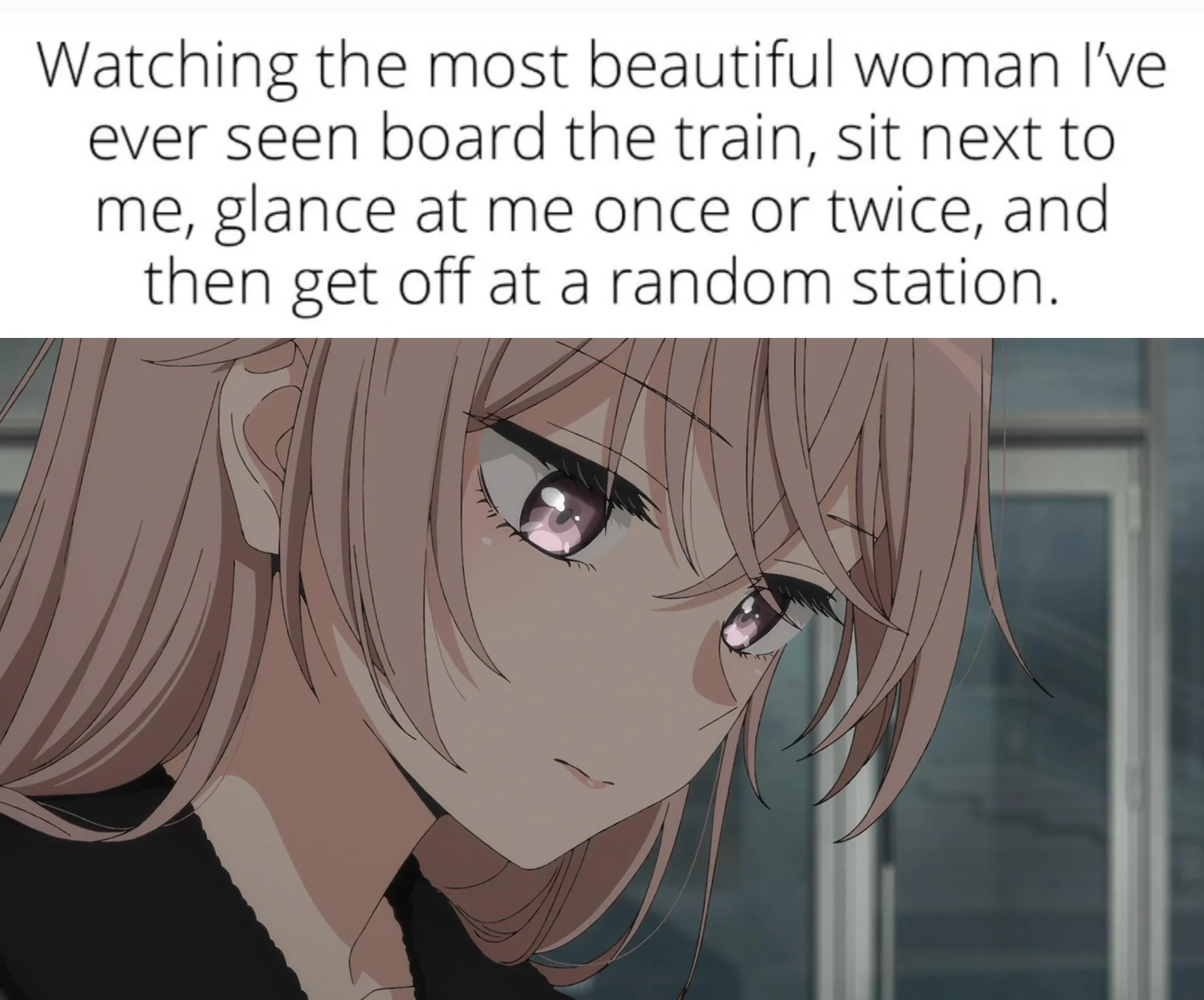 Caption: "Watching the most beautiful woman I've ever seen board the train, sit next to me, glance at me once or twice, and then get off at a random station."