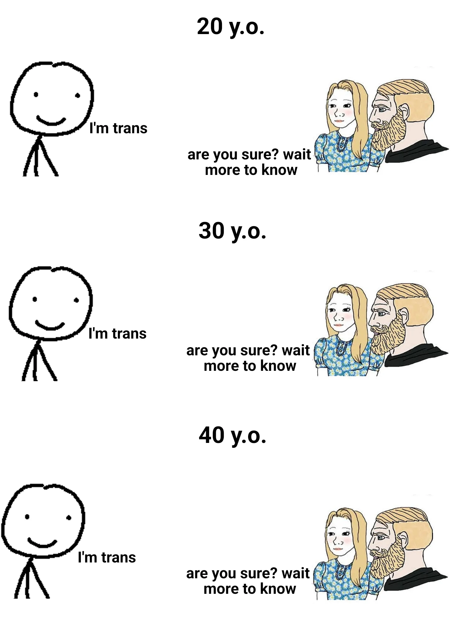 Caption: "20 y.o. I'm trans - are you sure? wait more to know 30 y.o. I'm trans - are you sure? wait more to know 40 y.o. I'm trans - are you sure? wait more to know"