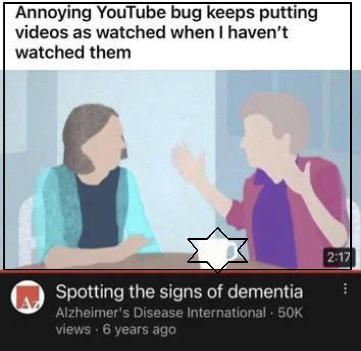 Caption: "Annoying YouTube bug keeps putting videos as watched when I haven't watched them Spotting the signs of dementia"