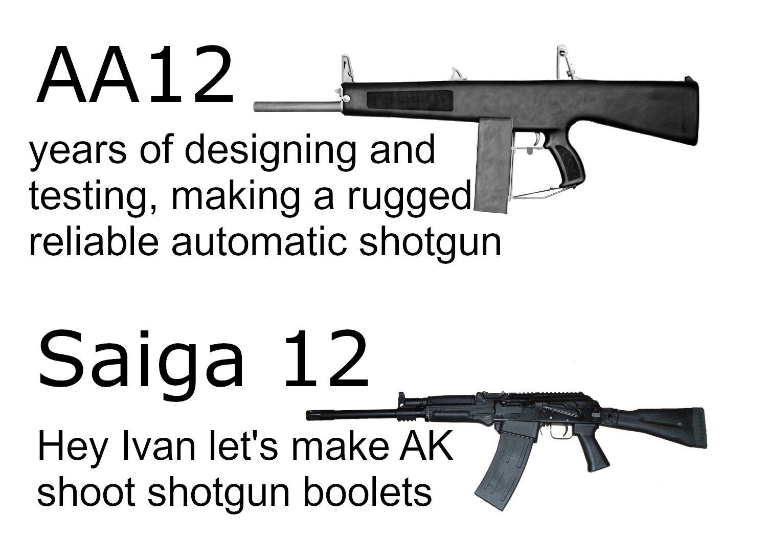 Caption: "AA12: years of designing and testing, making a rugged reliable automatic shotgun Saiga 12: Hey Ivan let's make AK shoot shotgun bullets"
