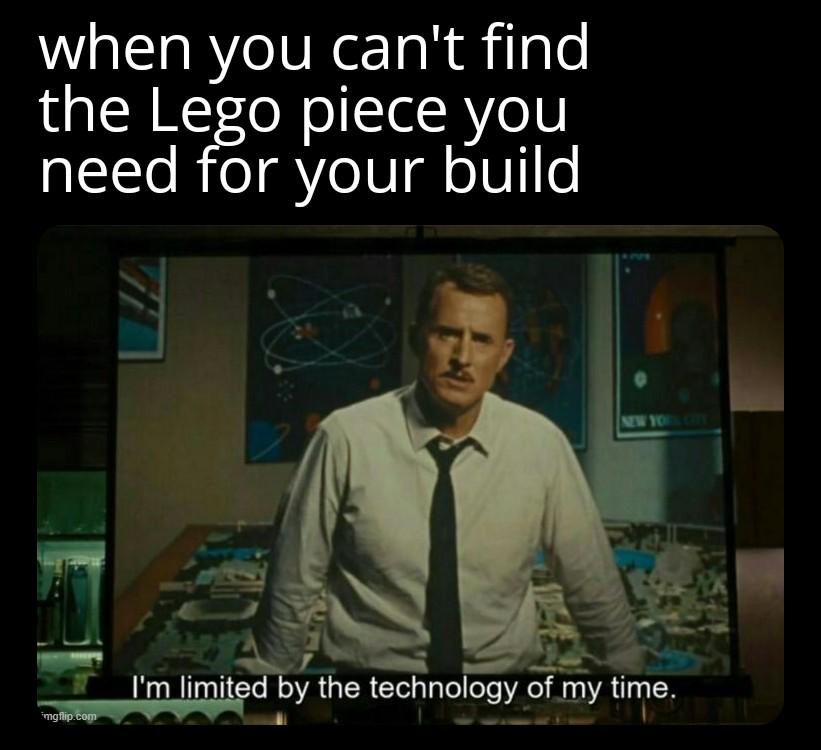 Caption: "when you can't find the Lego piece you need for your build I'm limited by the technology of my time."
