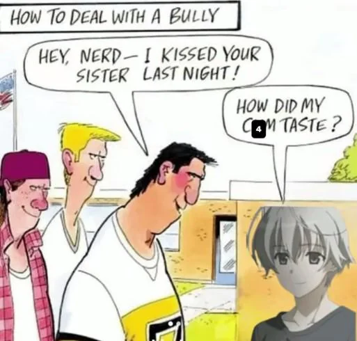 Apraksts: "How to deal with a bully Hey, Nerd - I kissed your sister last night! How did my cum taste?"