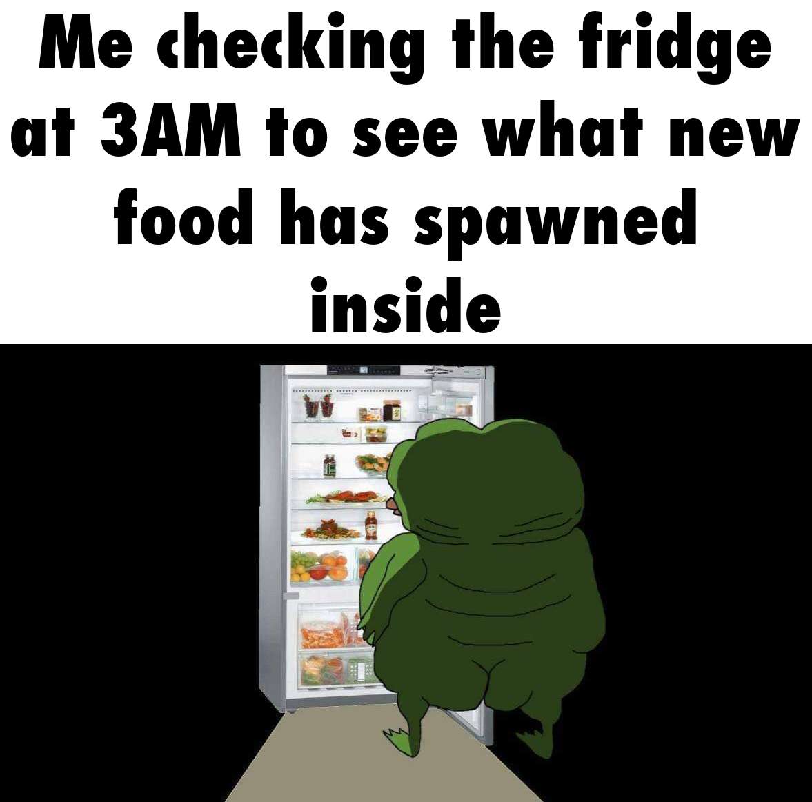 Apraksts: "Me checking the fridge at 3AM to see what new food has spawned inside"