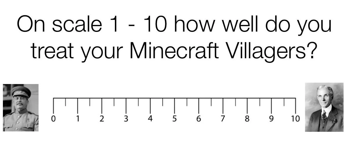 Apraksts: "On scale 1 - 10 how well do you treat your Minecraft Villagers? Joseph Stalin - Henry Ford"