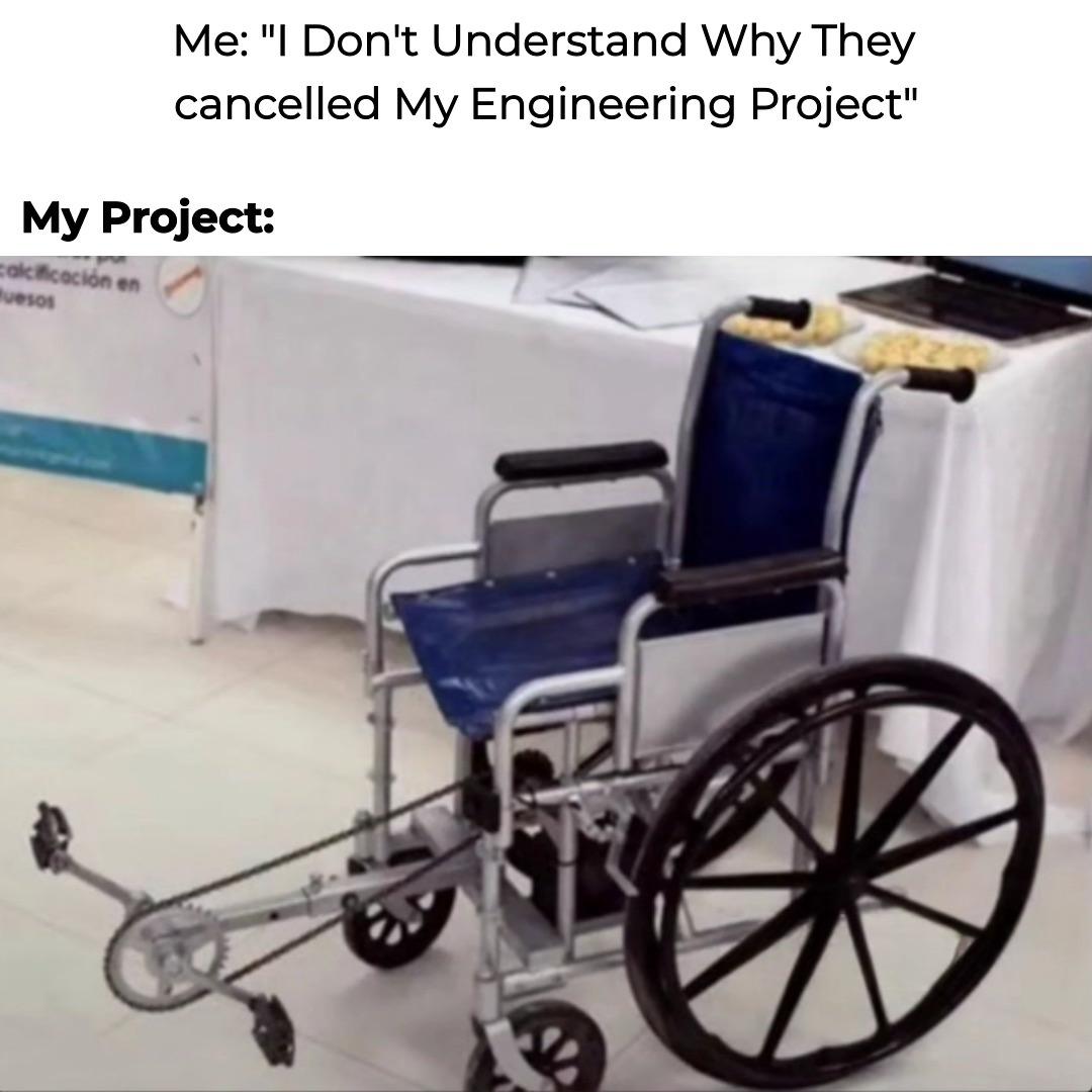 Apraksts: "Me: "I Don't Understand Why They cancelled My Engineering Project" My Project: *wheelchair with pedals*"