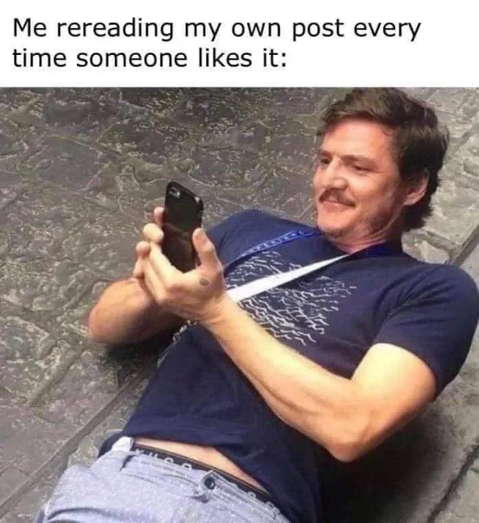 Apraksts: "Me rereading my own post every time someone likes it"
