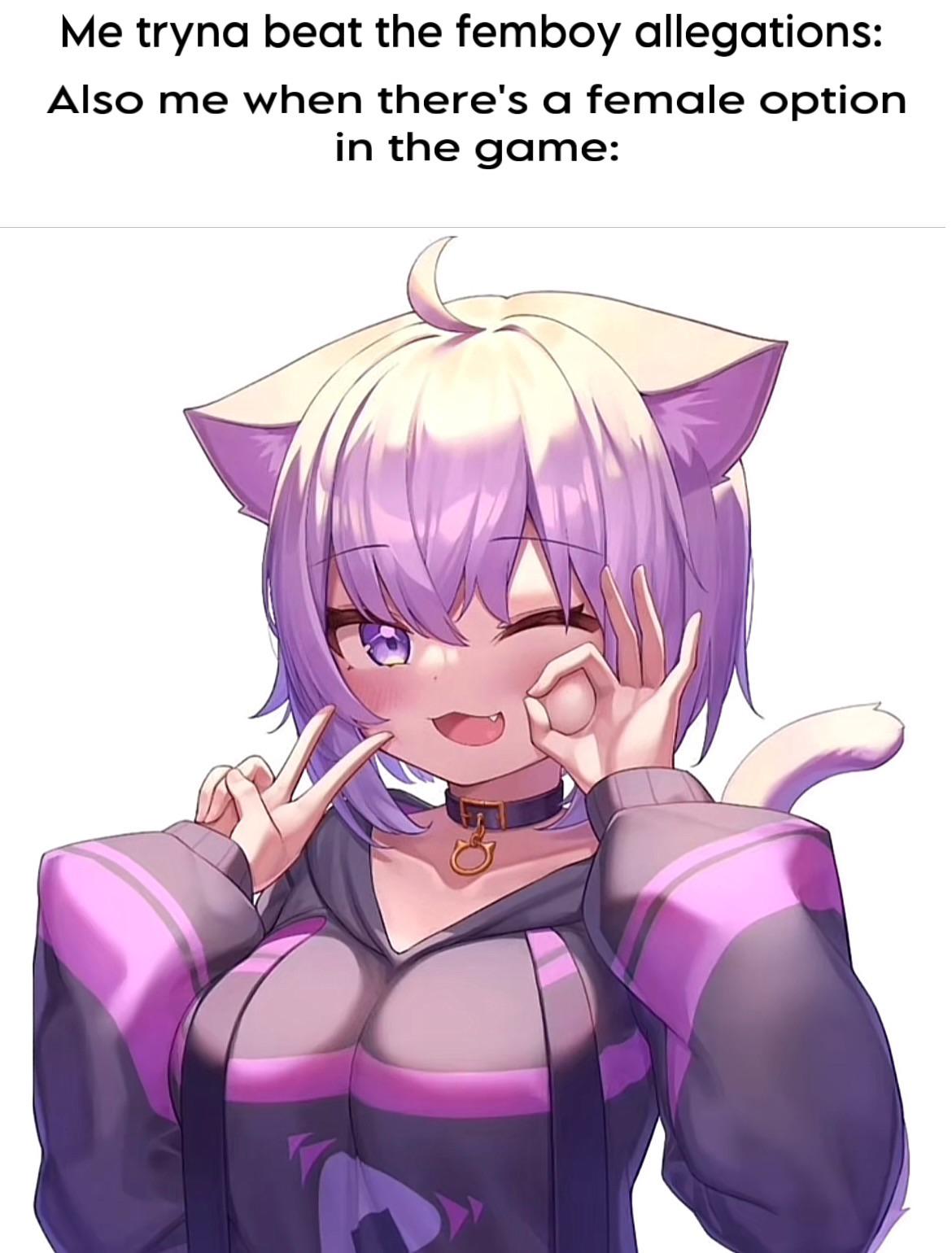 Apraksts: "Me tryna beat the femboy allegations - Also me when there's a female option in the game"