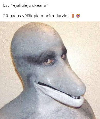 Apraksts: "Es: *ejakulēju okeānā* 20 gadus vēlāk pie manīm durvīm 🚪😭"