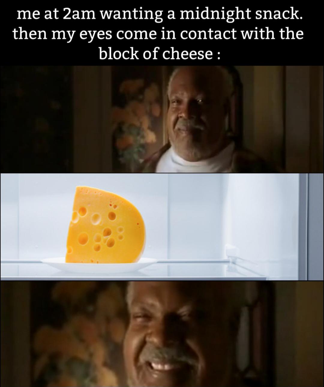 Apraksts: "me at 2am wanting a midnight snack. then my eyes come in contact with the block of cheese :"