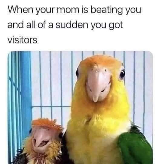 Apraksts: "When your mom is beating you and all of a sudden you got visitors"