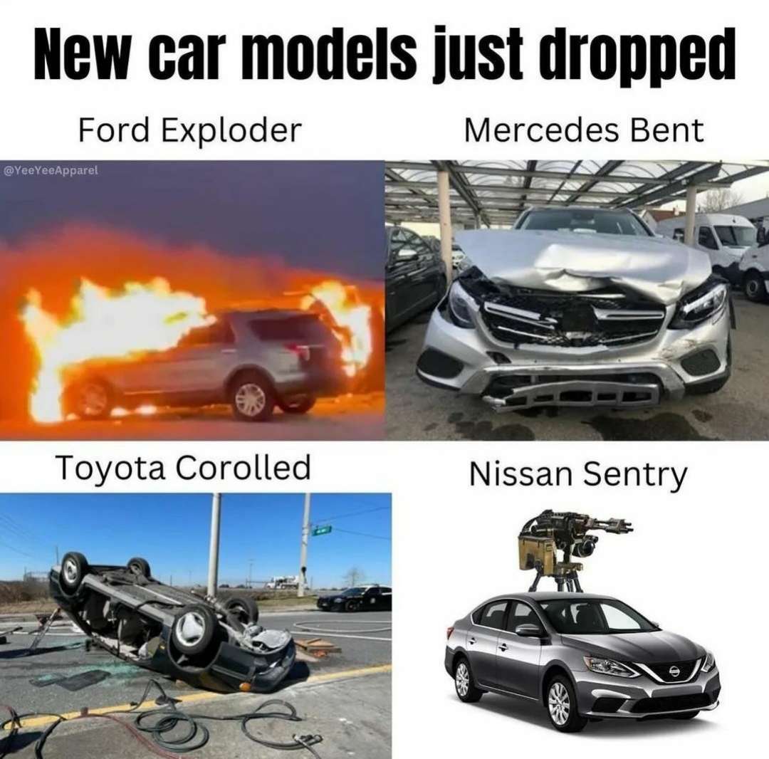 Apraksts: "New car models just dropped Ford Exploder, Mercedes Bent, Toyota Corolled, Nissan Sentry"