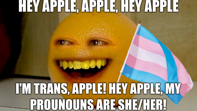 Apraksts: "Hey apple, apple, hey apple I'm trans, apple! Hey apple, my pronouns are she/her!"