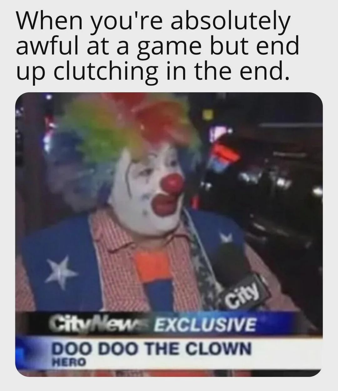 Apraksts: "When you're absolutely awful at a game but end up clutching in the end. Doo Doo the Clown - Hero"