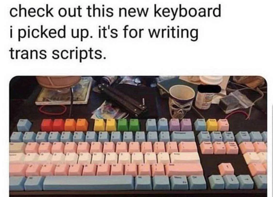 Apraksts: "check out this new keyboard i picked up. it's for writing trans scripts."