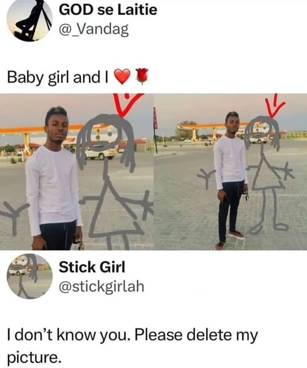 Apraksts: "Baby girl and I ❤️🌹 Stick Girl: I don't know you. Please delete my picture."