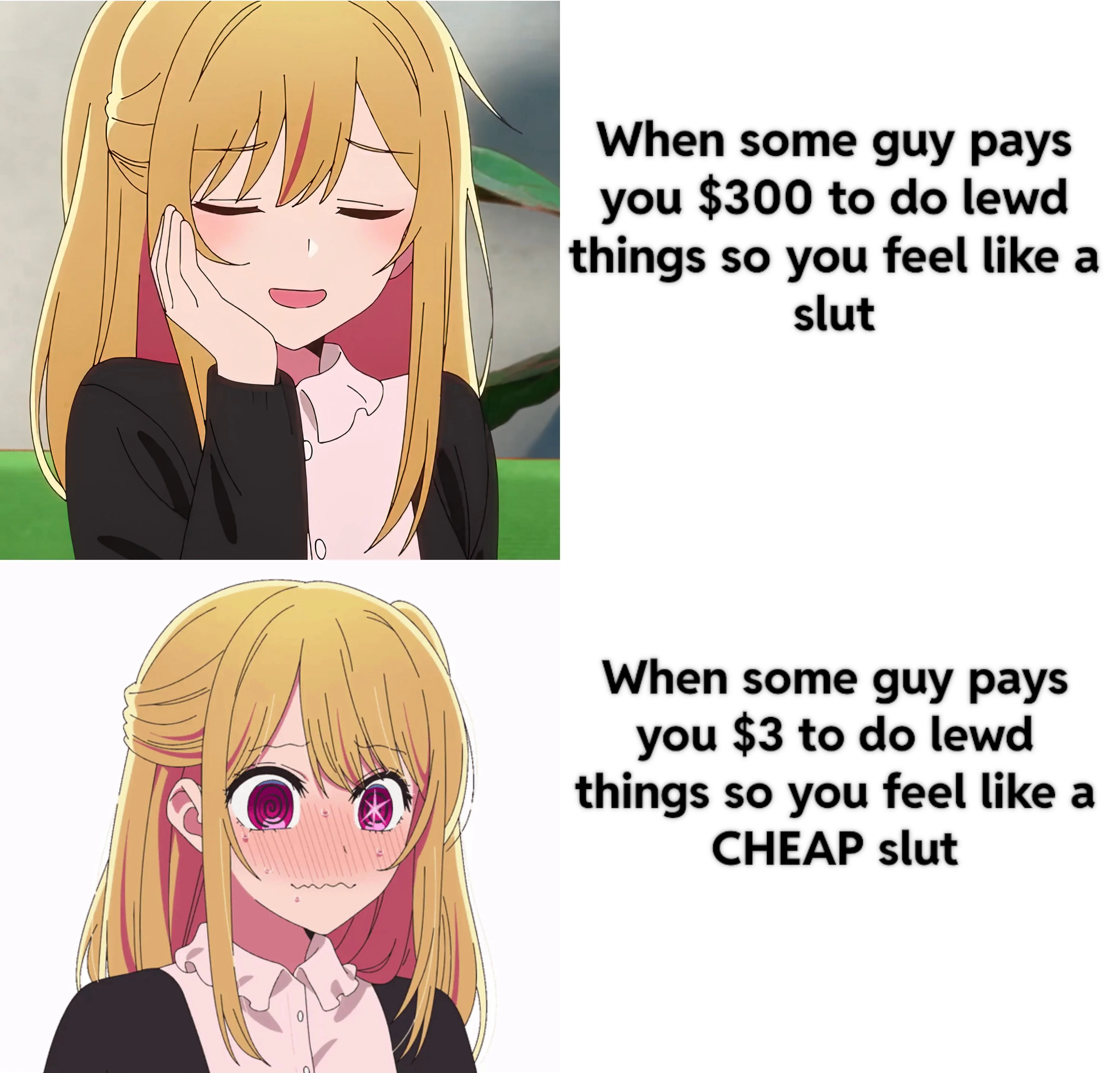 Apraksts: "When some guy pays you $300 to do lewd things so you feel like a slut - When some guy pays you $3 to do lewd things so you feel like a CHEAP slut"