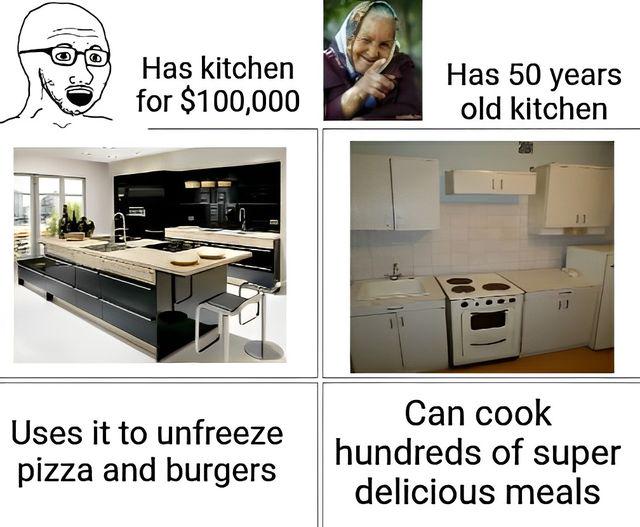 Apraksts: "Has kitchen for $100,00 - Uses it to unfreeze pizza and burgers Has 50 years old kitchen - Can cook hundreds of super delicious meals"