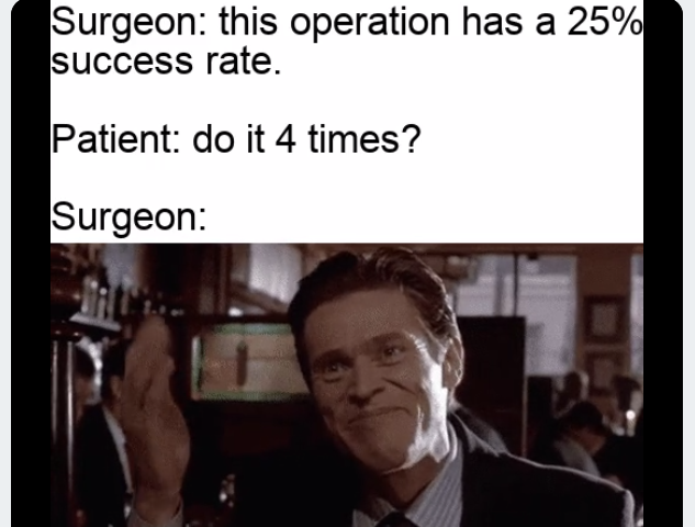 Apraksts: "Surgeon: this operation has a 25% success rate. Patient do it 4 times? Surgeon:"