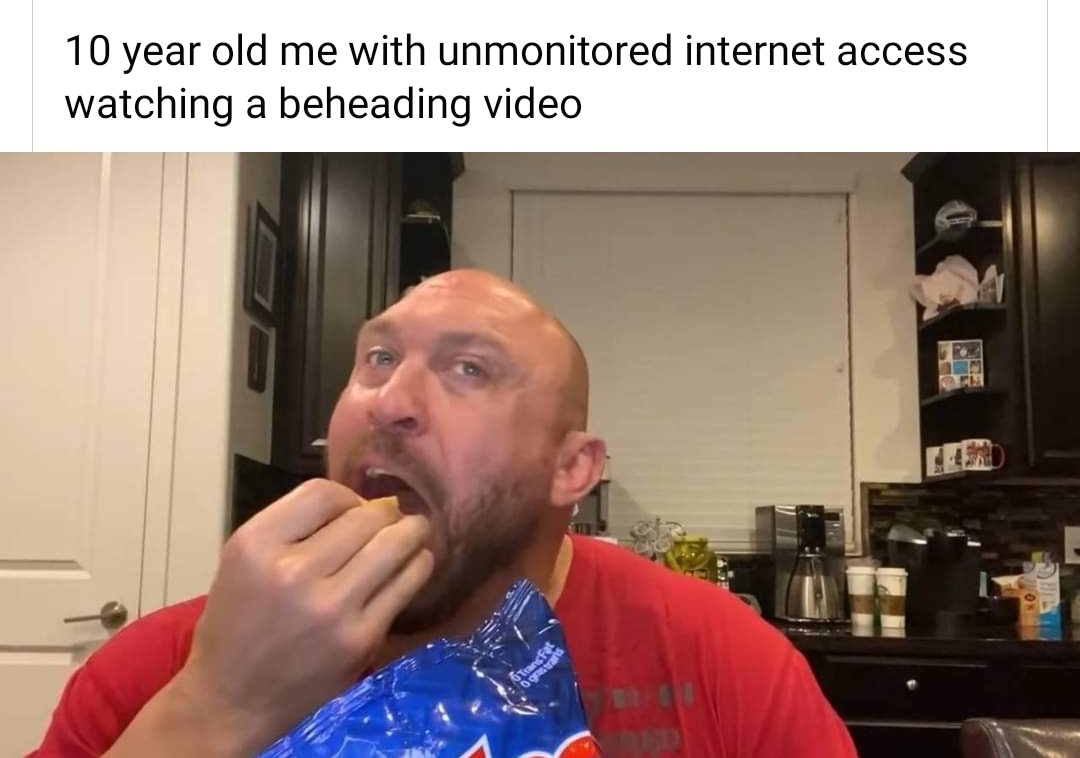 Apraksts: "10 year old me with unmonitored internet access watching a beheading video"