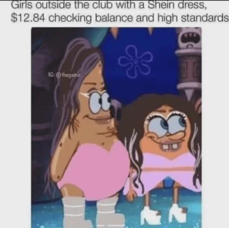 Apraksts: "Girls outside the club with a Shein dress, $12.84 checking balance and high standards"