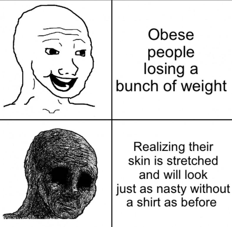 Apraksts: "Obese people losing a bunch of weight Realizing their skin is stretched and will look just as nasty without a shirt as before"