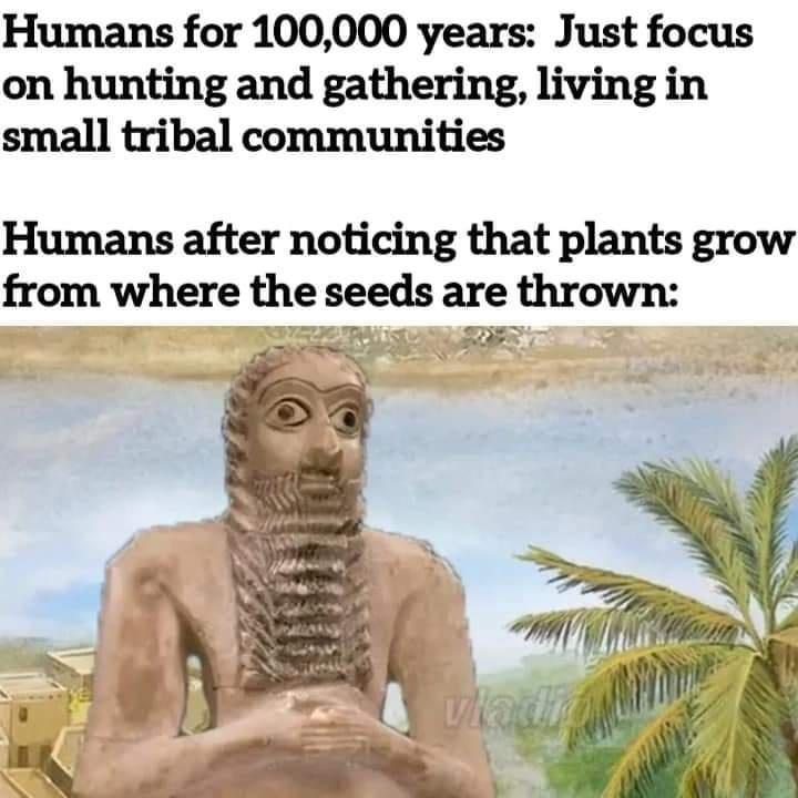 Apraksts: "Humans for 100,000 years: Just focus on hunting and gathering, living in small tribal communities Humans after noticing that plants grow from where the seeds are thrown:"