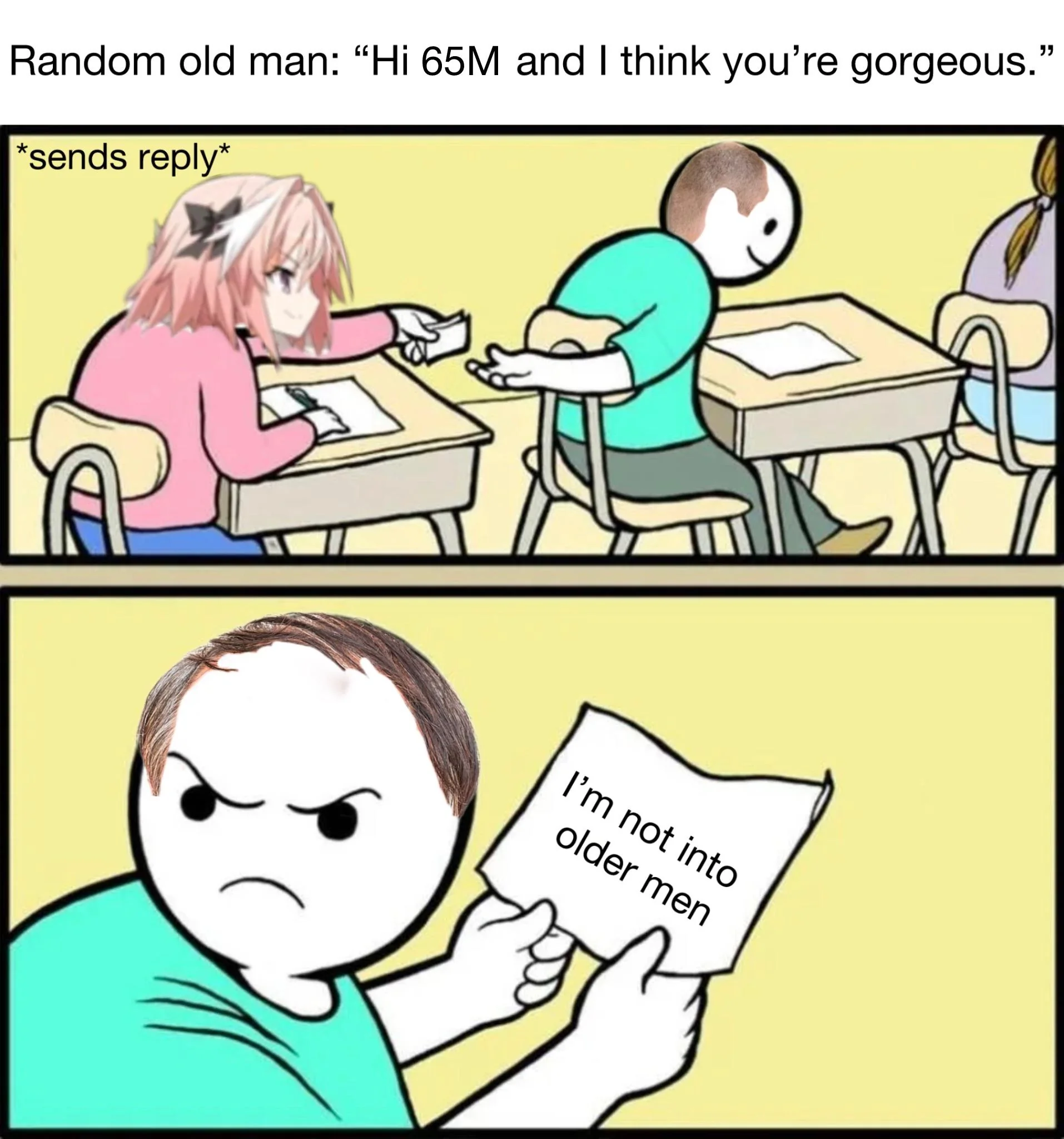 Apraksts: "Random old man: "Hi 65M and I think you're gorgeous." *sends reply* I'm not into older men"