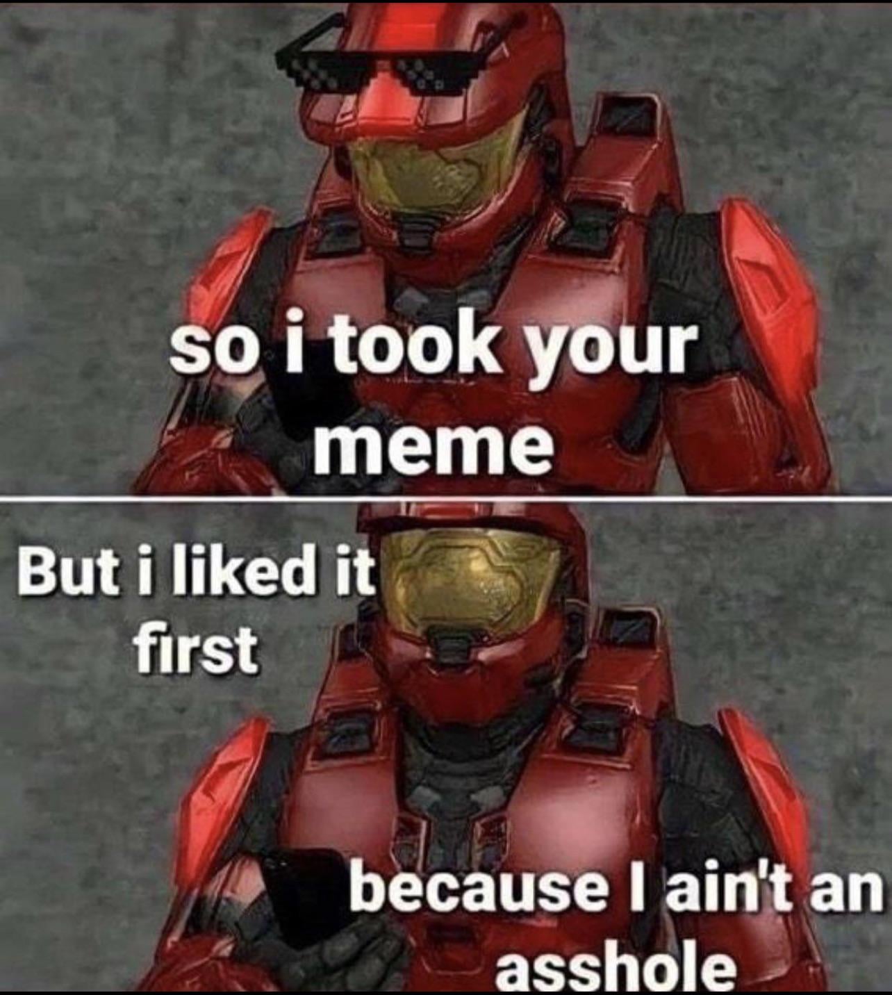 Apraksts: "so i took your meme But i liked it first; because I ain't an asshole"