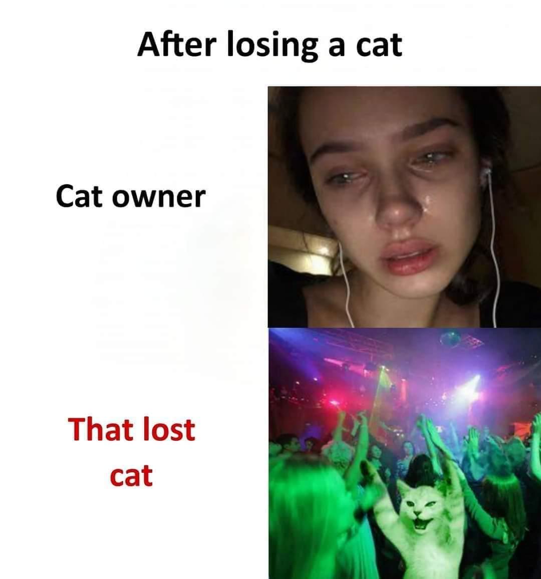 Apraksts: "After losing a cat Cat owner 😭 That lost cat 💃"