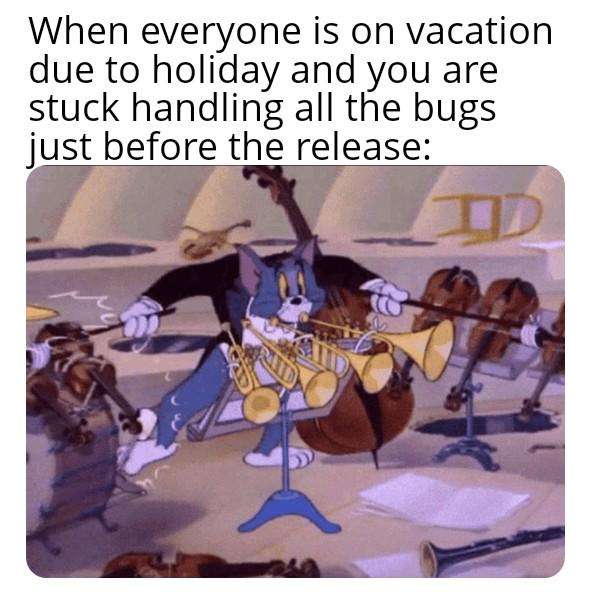 Apraksts: "When everyone is on vacation due to holiday and you are stuck handling all the bugs just before the release:"