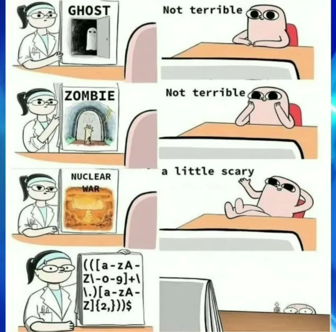 Apraksts: "Ghost - Not terrible Zombie - Not terrible Nuclear war - a little scary (([a-zA-Z\-0-9]+\\.)[a-zA-Z]{2,}))$ - 😱"