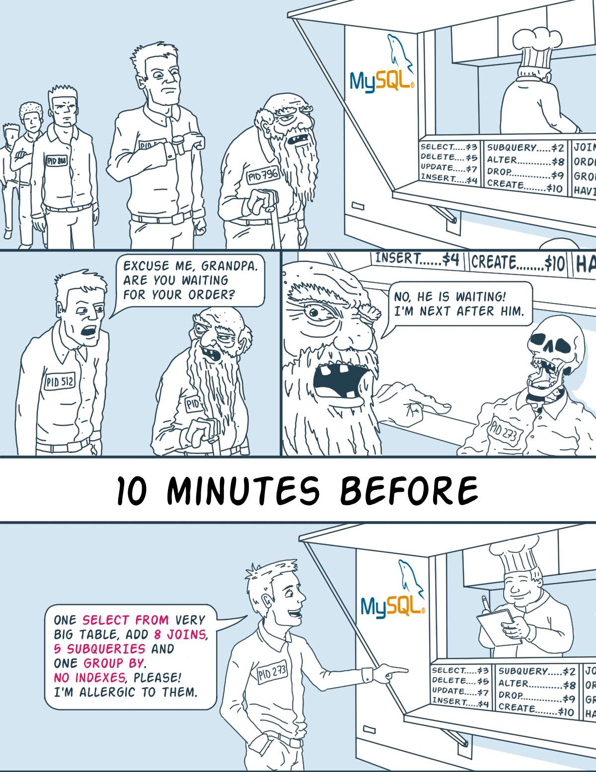 Apraksts: "MySQL Excuse me, grandpa. Are you waiting for your order? No, he is waiting! I'm next after him. *10 minutes before* One select from very big table, add 8 joins, 5 subqueries and one group by. No indexes, please! I'm allergic to them."