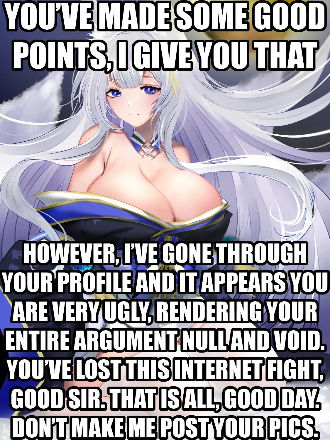 Apraksts: "You've made some good points, I give you that However, I've gone through your profile and it appears you are very ugly, rendering your entire argument null and void. You've lost this internet fight, good sir. That is all, good day. Don't make me post your pics."