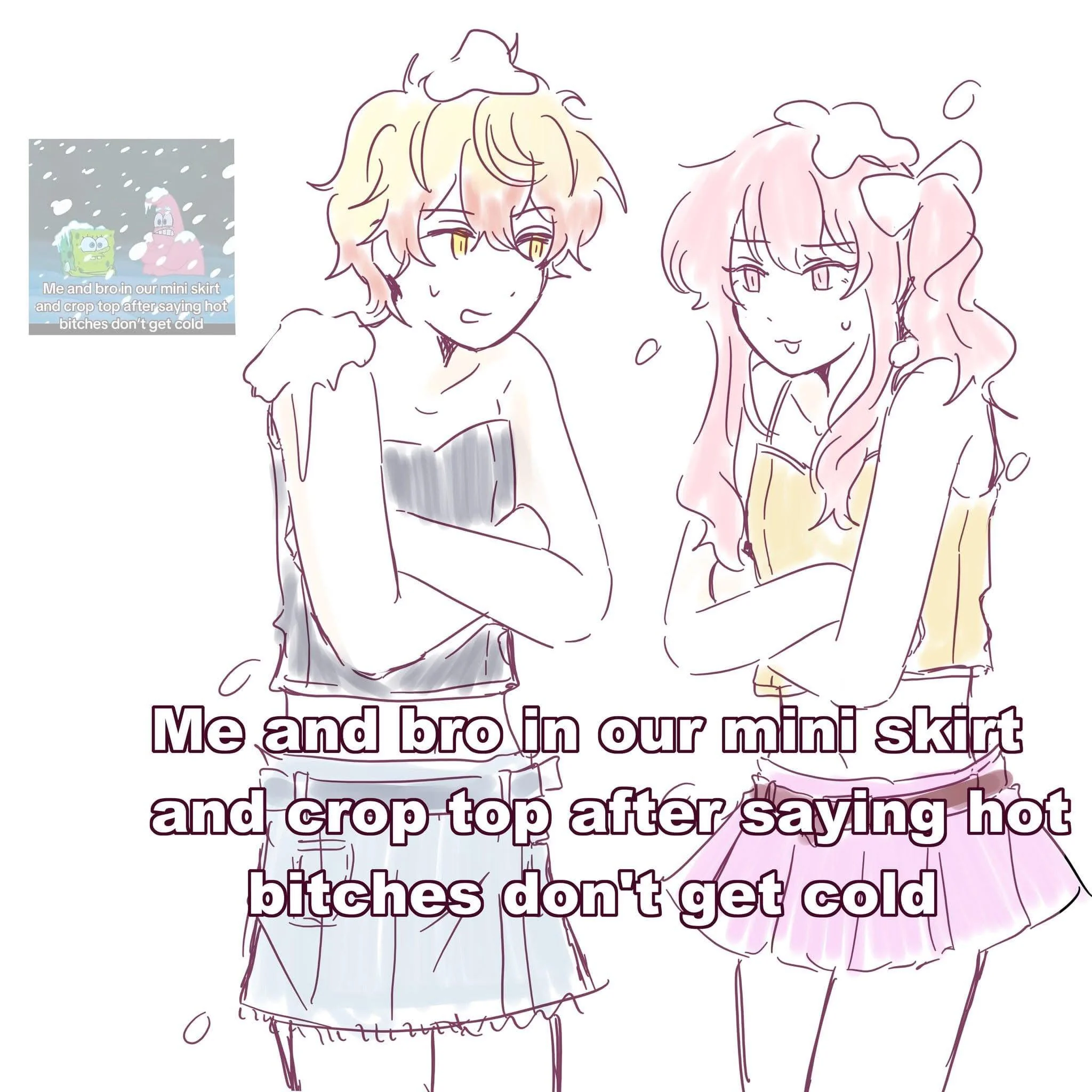 Apraksts: "Me and bro in our mini skirt and crop top after saying hot bitches don't get cold"