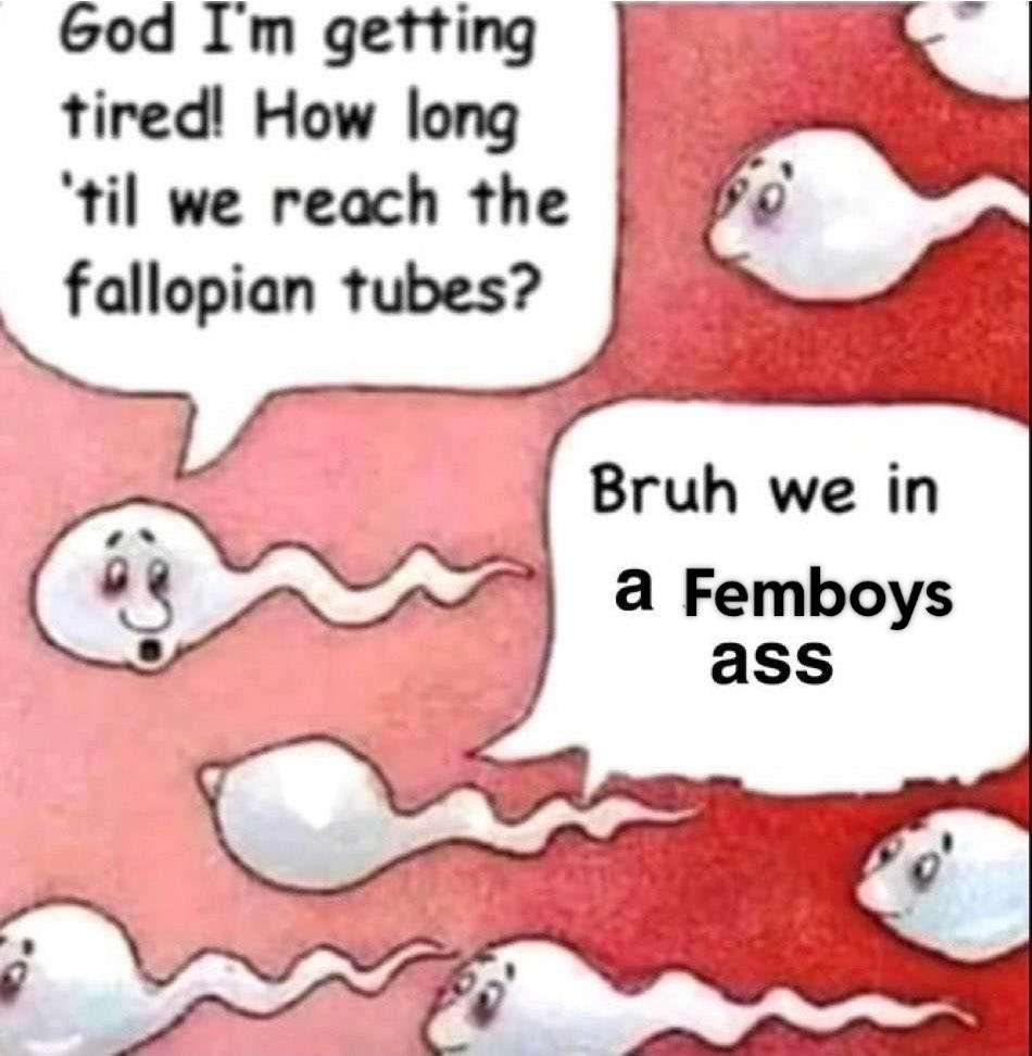 Apraksts: "God I'm getting tired! How long 'til we reach the fallopian tubes? Bruh we in a Femboys ass"