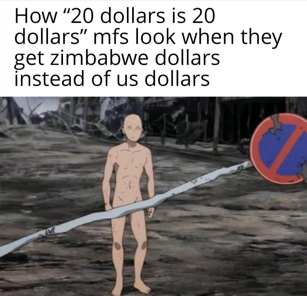Apraksts: "How "20 dollars is 20 dollars" mfs look when they get zimbabwe dollars instead of us dollars"