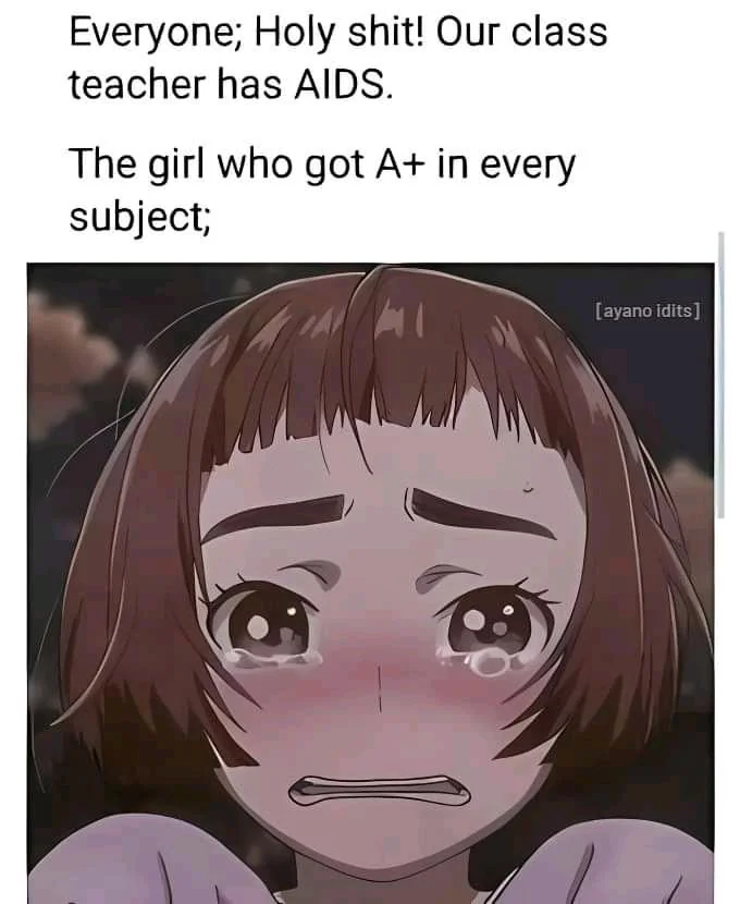 Apraksts: "Everyone; Holy shit! Our class teacher has AIDS. The girl who got A+ in every subject;"