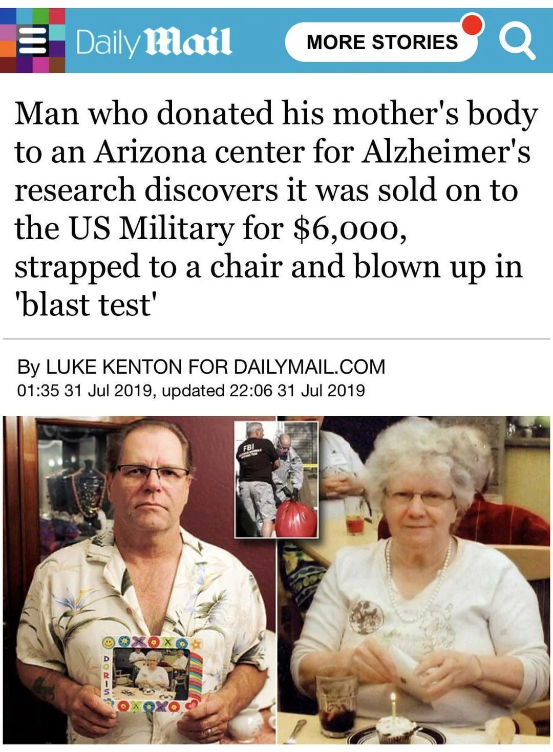 Apraksts: "Man who donated his mother's body to an Arizona center for Alzheimer's research discovers it was sold on to the US Military for $6,000, strapped to a chair and blown up in 'blast test'"