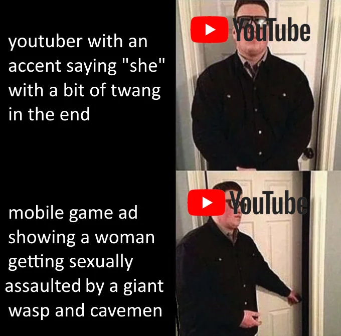 Apraksts: "youtuber with an accent saying "she" with a bit of twang in the end mobile game ad showing a woman getting sexually assaulted by a giant wasp and cavemen"