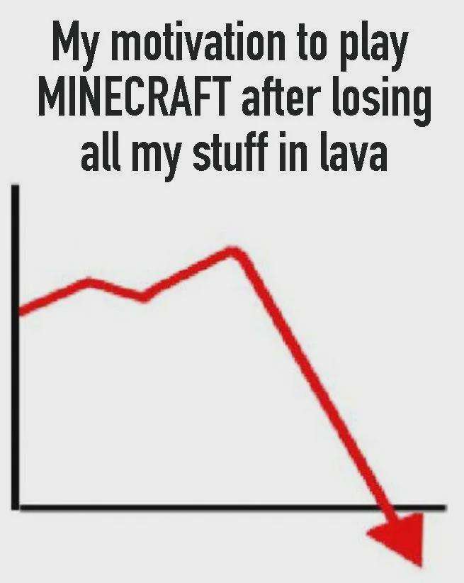 Apraksts: "My motivation to play Minecraft after losing all my stuff in lava"