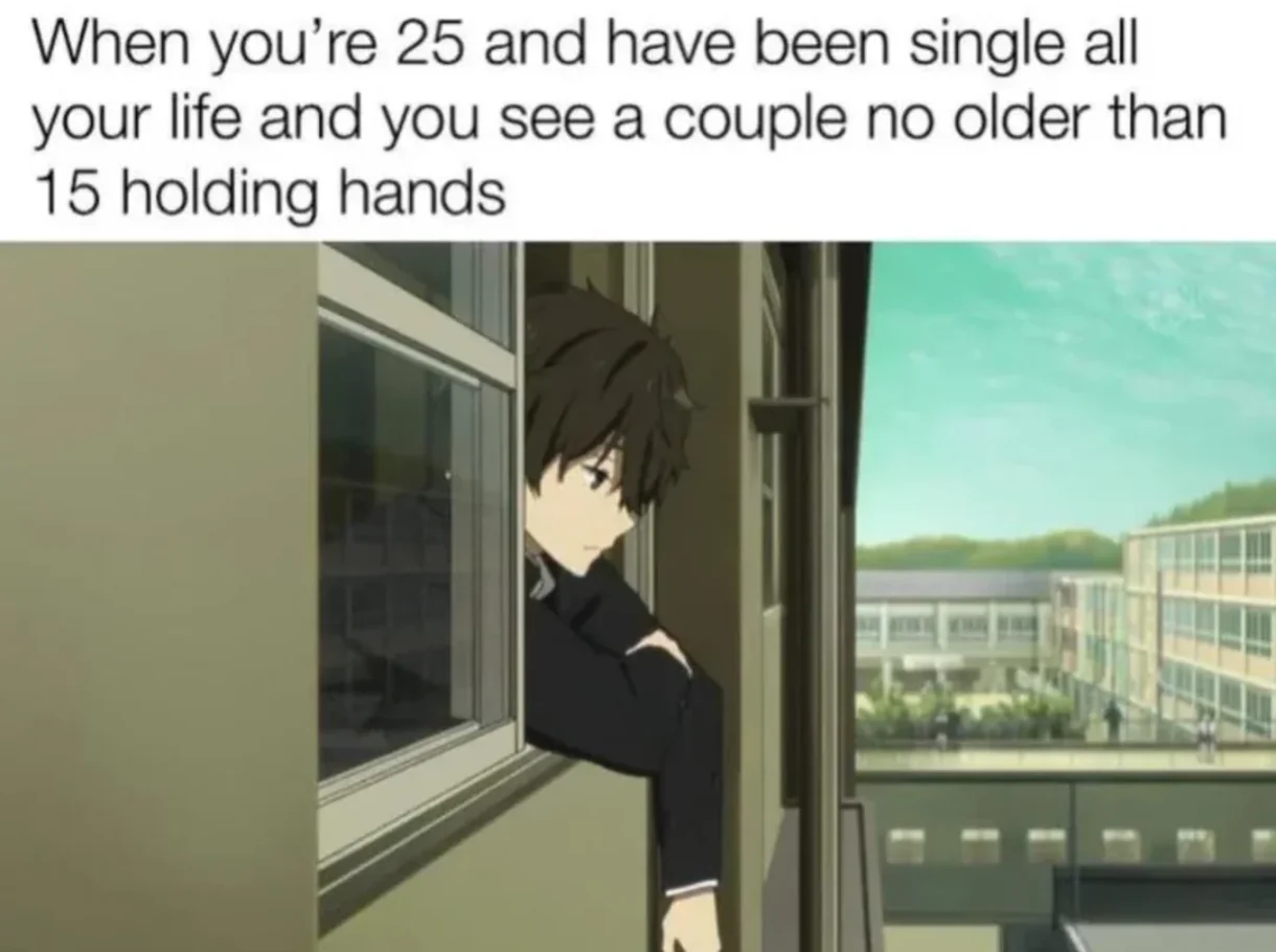 Apraksts: "When you're 25 and have been single all your life and you see a couple no older than 15 holding hands"