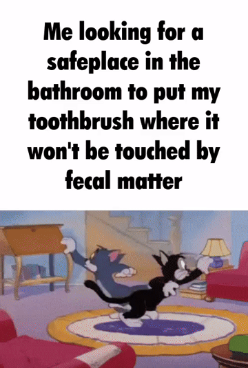 Apraksts: "Me looking for a safeplace in the bathroom to put my toothbrush where it won't be touched by fecal matter"