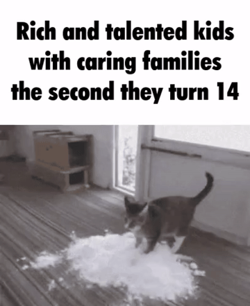 Apraksts: "Rich and talented kids with caring families the second they turn 14"