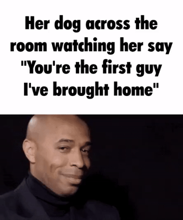 Apraksts: "Her dog across the room watching her say "You're the first guy I've brought home""