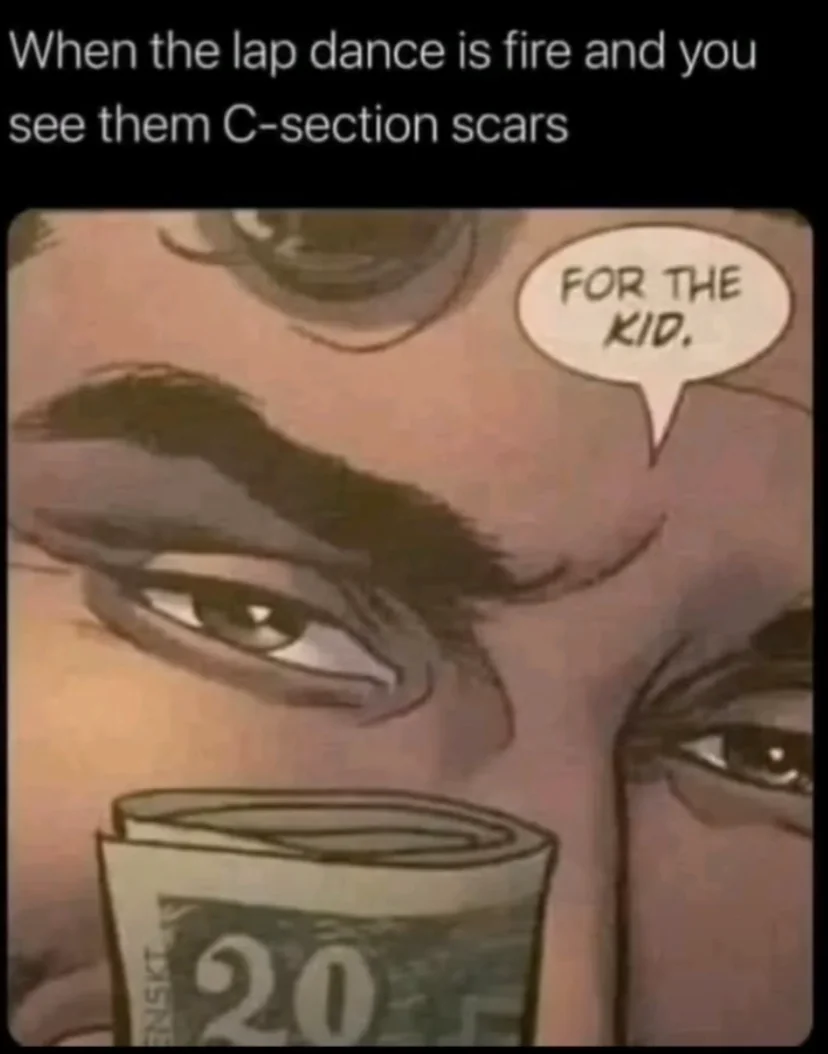 Apraksts: "When the lap dance is fire and you see them C-section scars For the kid."