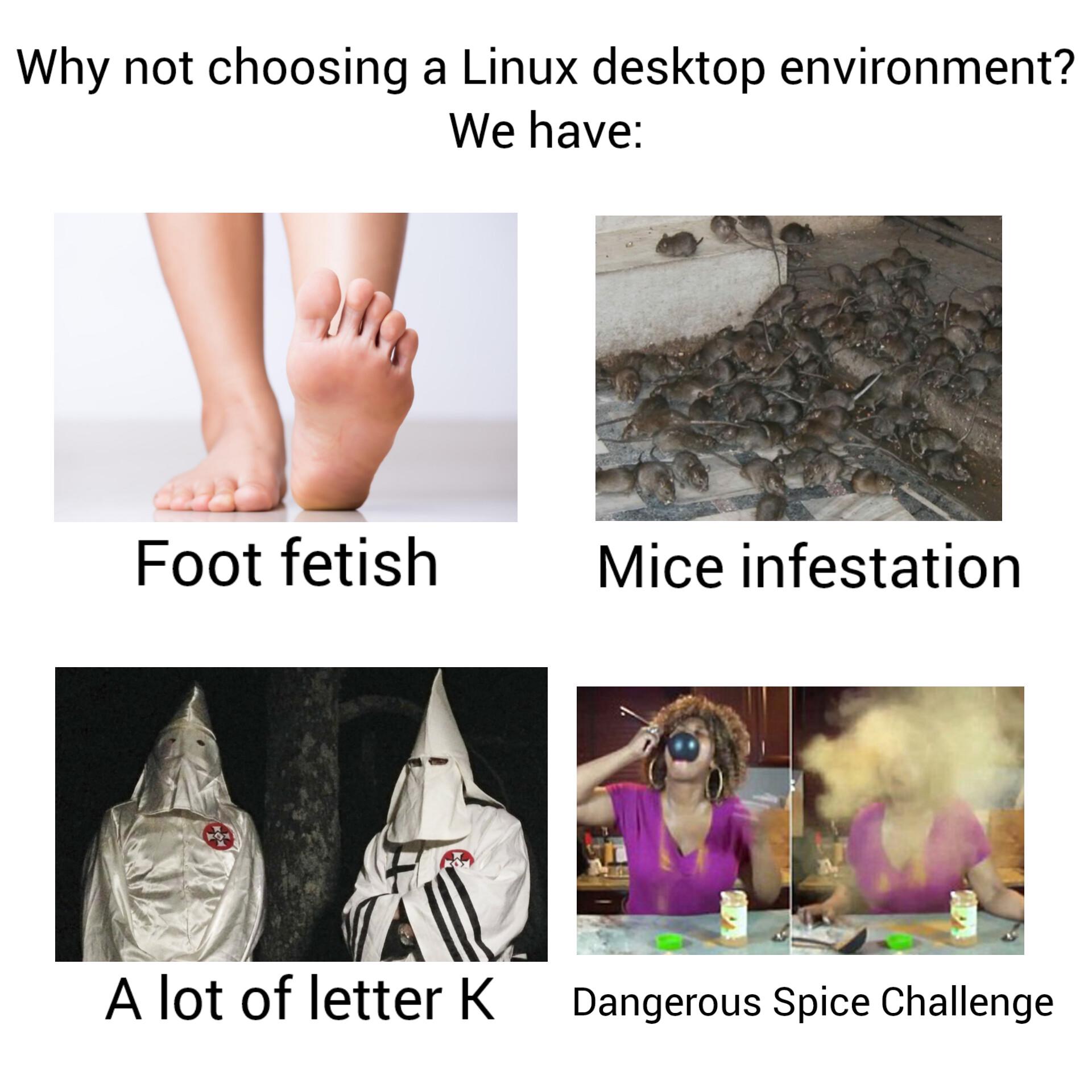 Apraksts: "Why not choosing a Linux desktop environment? We have: Foot fetish - Mice infestation - A lot of letter K - Dangerous Spice Challenge"