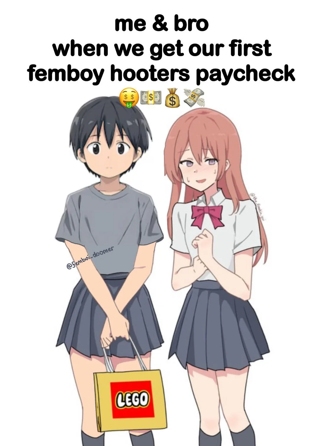 Apraksts: "me & bro when we get our first femboy hooters paycheck 🤑💵💰💸"
