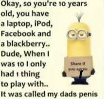 Apraksts: "Okay, so you're 10 years old, you have a laptop, iPod, Facebook and a blackberry.. Dude, When I was 10 I only had 1 thing to play with.. It was called my dads penis"